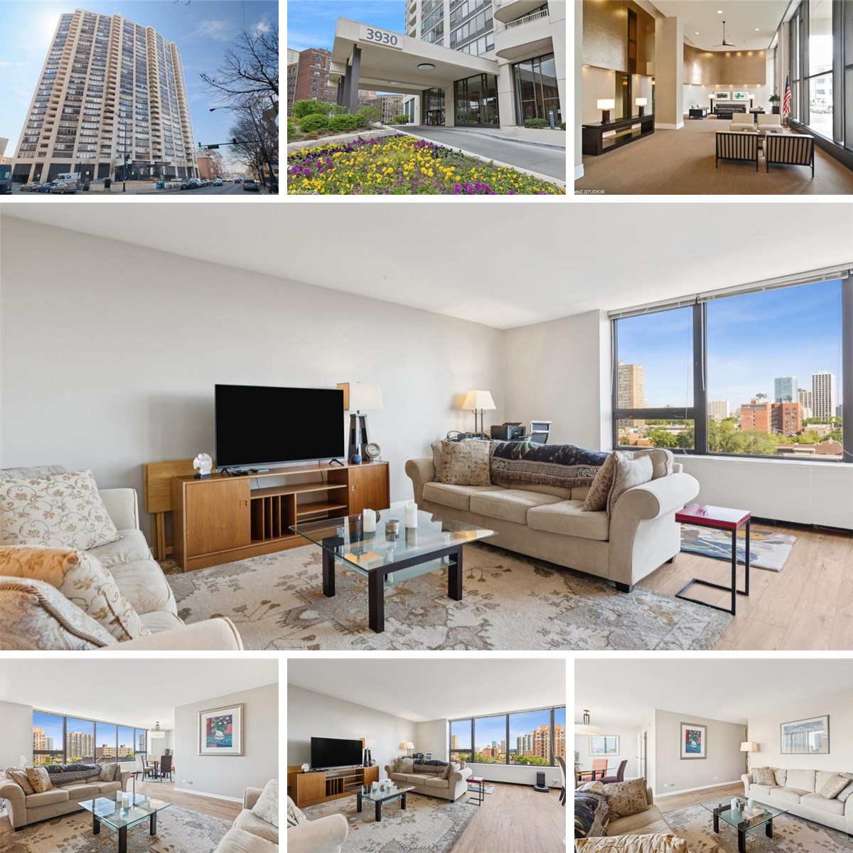 Rarely available and the most sought-after floorplan at Lake Park Plaza, this approx. 1250sf 2bed/2bath Corner Unit is not to be missed! An impeccable home that boasts amazing panoramic south, north, east and west views with a peak of Lake Michigan, City skyline and Wrigley Field. The home has been tastefully renovated and features new wide plank ash blonde luxury vinyl flooring throughout adding a light open feel to the expansive living/dining area. The eat in kitchen boasts a huge pantry closet, newer SS appliances and white quartz countertops. The generous sized primary bedroom has updated ensuite bathroom, ample closet space and a balcony to watch those evening sunsets. The 2nd bedroom and updated guest bathroom with walk-in shower completes the perfect home. This is a very well-managed building with top-of-the-line amenities including outdoor pool and sundeck with gas grills and fire pits, huge fitness center, tennis court, basketball court, dog run, kiddie's play area and more. Garage valet parking is readily available. The building recently went through a major renovation of its hallways. A pet friendly building and Investors Welcome! No Rental Cap. Walking distance to Lake Michigan, shopping and entertainment.